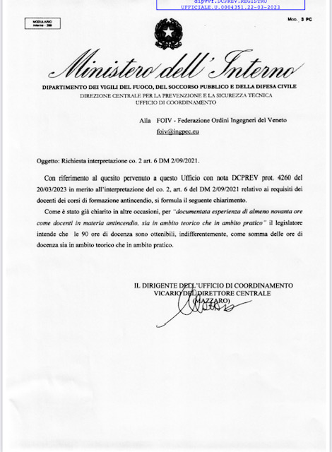 - Esperienza di almeno 90 ore come docenti in materia antincendio, in ambito teorico, alla data di entrata in vigore del D.M. 2/9/21;